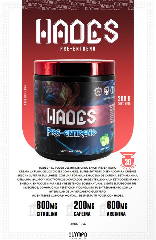 Con una fórmula explosiva de cafeína, beta-alanina, citrulina malato y nootrópicos avanzados, HADES te lleva a un estado de máxima energía, enfoque imparable y resistencia sobrenatural.