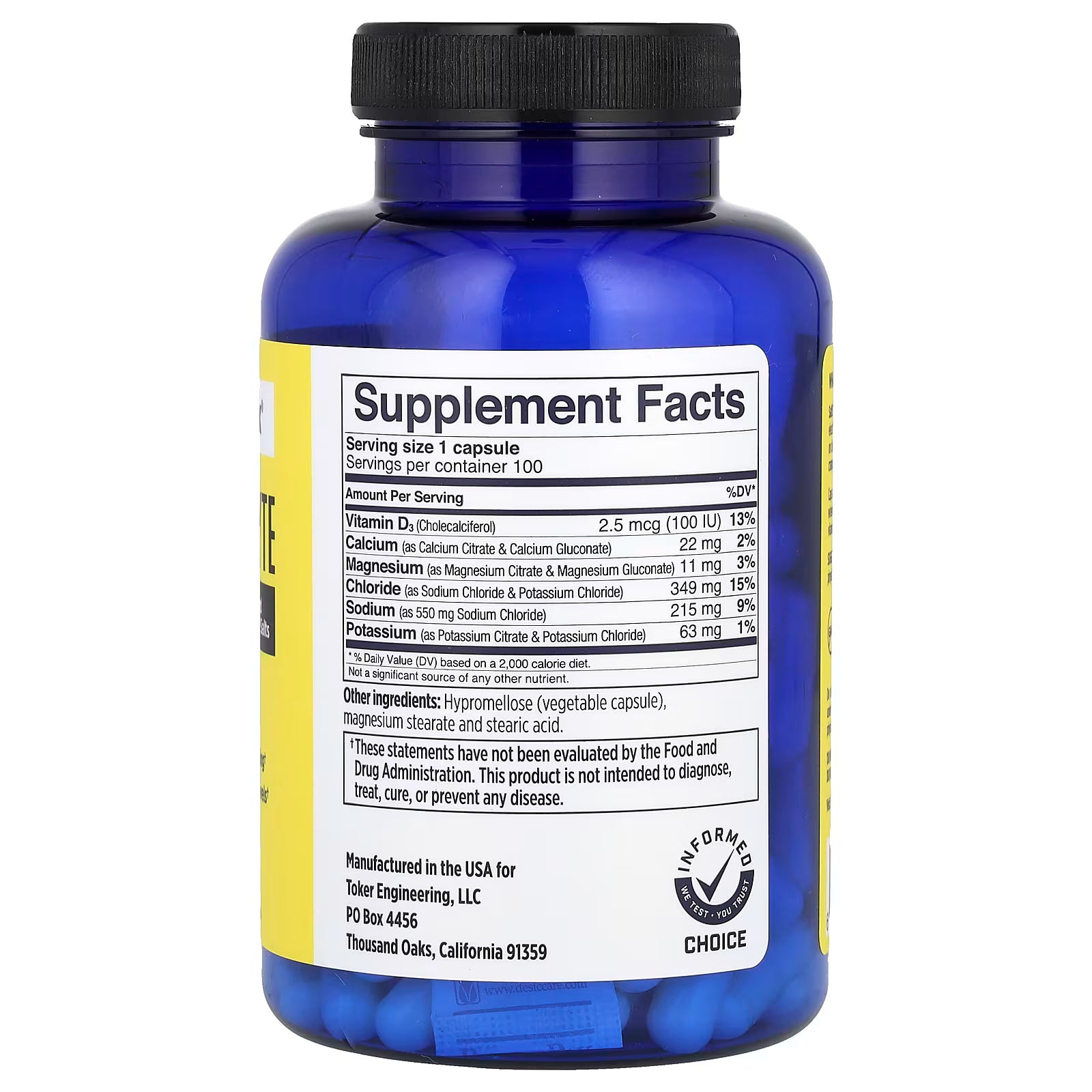 Cada cápsula contiene: 215 mg de sodio, 63 mg de potasio, 22 mg de calcio, 11 mg de magnesio. 100 UI de vitamina D para ayudar al cuerpo a absorber y utilizar el calcio.